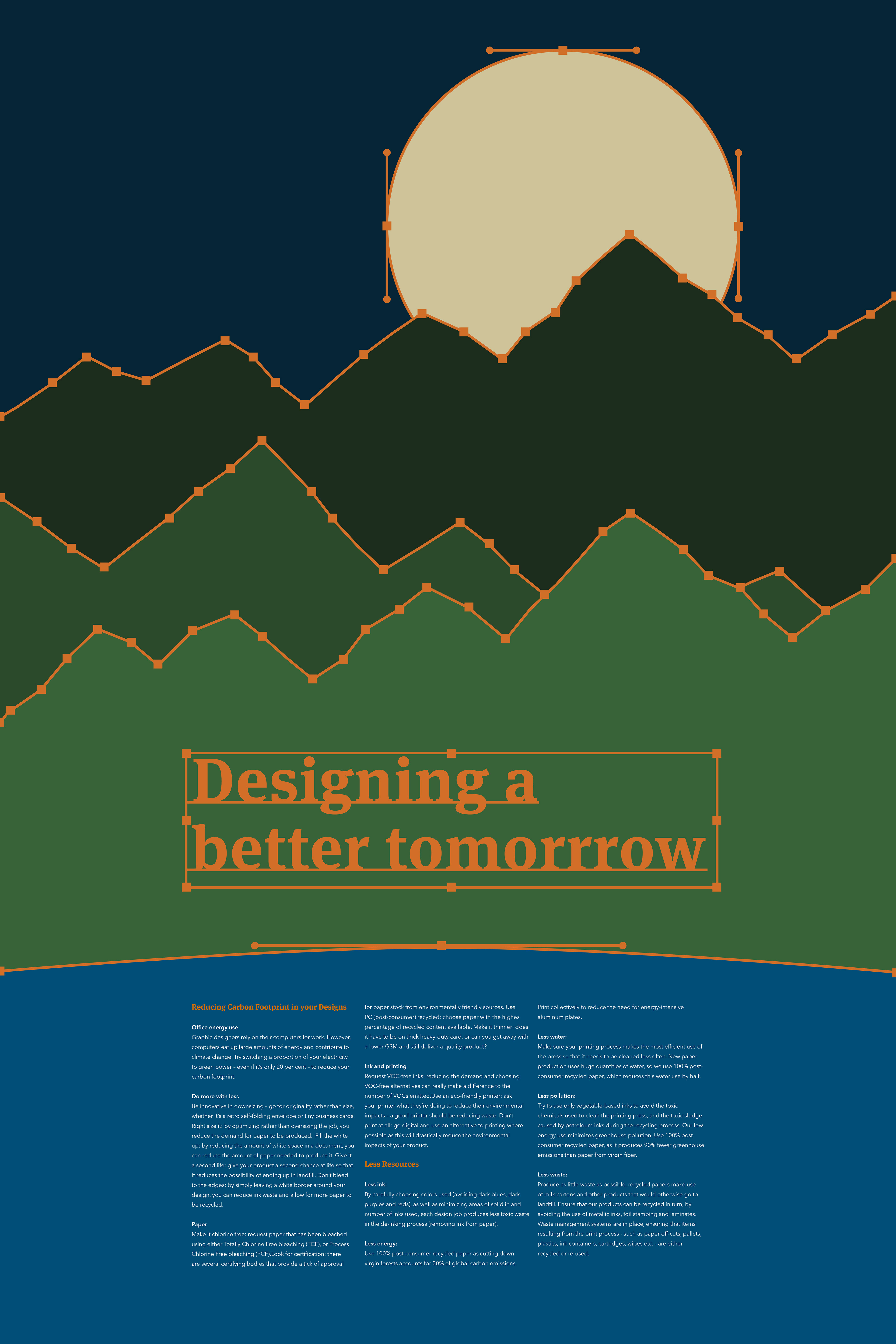 For my poster, I originally wanted to show a ball of rubber bands/yarn that gives an abstract view of the Earth and how the issues are confusing with no immediate solution. As a problem solver I wanted to show a solution to the issue of climate change and design 100% clean to the earth. As I researched, I realized that there is no solution yet, so I shifted to showing the mess this issue with no end. That poster got a little too abstract, so I completely changed to a more literal approach of designing a better tomorrow. I decided to illustrate the designing and added text that shows how we can design better and reduce resources. There is no solid answer to designing with zero impact on the Earth, but we can greatly reduce our impact till we figure out the next solution. For both parts of this project, they were to be printed on environmentally friendly paper with environmentally ink as well. As I was deciding to make this project, I did not want to make it hypocritical and use up paper and ink that add to the issues at hand. Due to Covid-19, this project has not been printed yet.